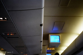 接下來我學到了一個很重要的教訓。以後如果搭長途飛機的話,一定要隨身攜帶水與口罩。因為,機艙裡面的空氣真的是乾燥到一種恐怖的境界。在睡過一輪之後醒來,發現不僅嘴唇乾得令人難過,連鼻腔喉嚨也感覺十分的不舒服。只好向空中小姐拿水喝,才減輕了一點難過的徵狀。接下來還是繼續睡,睡到空中小姐又開始準備給予下一餐時,才大致清醒。