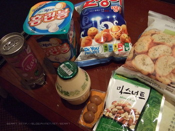(買了一堆零食,右上角的蒜味餅乾台灣的小七也有喔,不過韓國比較便宜)