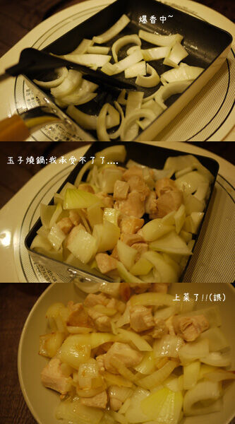 所以當我把雞肉也丟下去時,稍微用力一點洋蔥就會從玉子燒鍋前端飛出去。